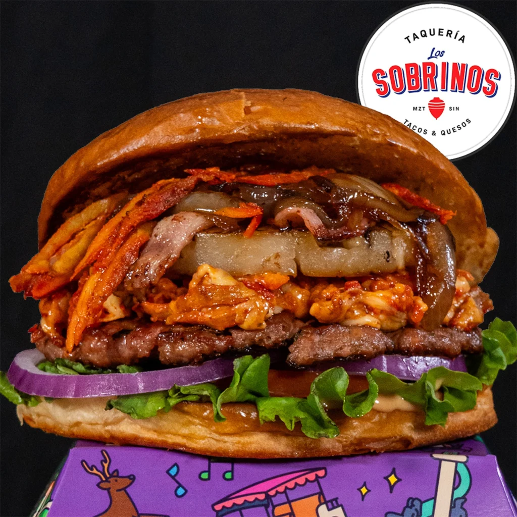 ¡Edición Especial! Jugosa carne bichi abrigada con doble porción de pastor gratinado de Taquería Los Sobrinos y piña a la plancha con tocino, verduras y pepinillos entre Pan Casero. Por tiempo limitado.